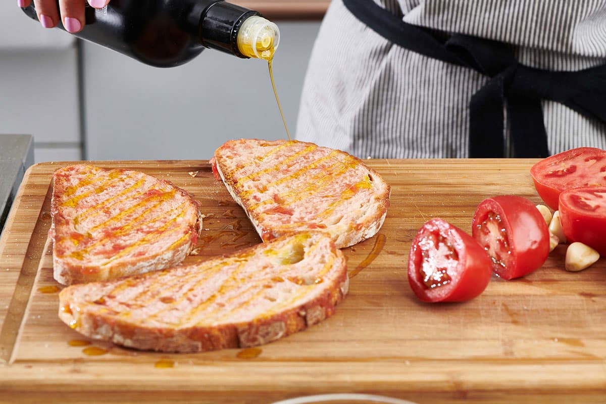- Add the tomato: Rub the cut halves of the tomatoes over the bread, squeezing a bit as you go.