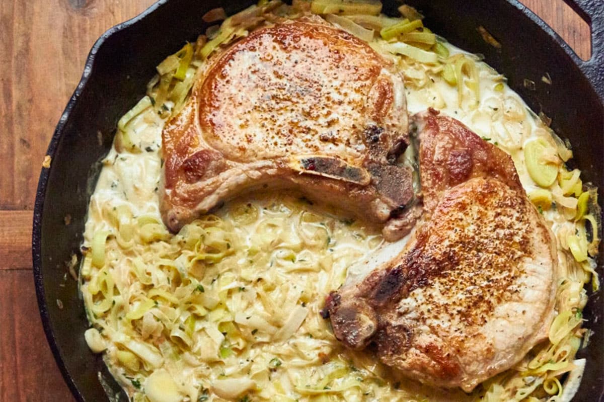 Case in point, these pork chops. You quickly sear the chops up, and finish by making a rich, creamy leek pan sauce in the same skillet you used to brown the chops in. The seared chops then finish cooking in the sauce, and you have a one-dish meal that you might be pleased to have served up to you at a restaurant.